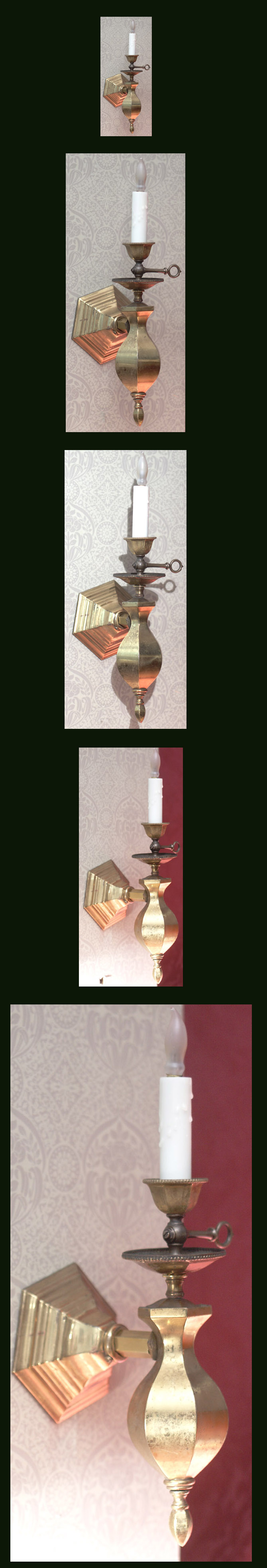 This is a pair of gas wall sconces. Circa 1900. They have good detail in a simple form with hexagonal tubing. They have been fitted with electric candle covers that have been dipped in beeswax to simulate a wax candle!